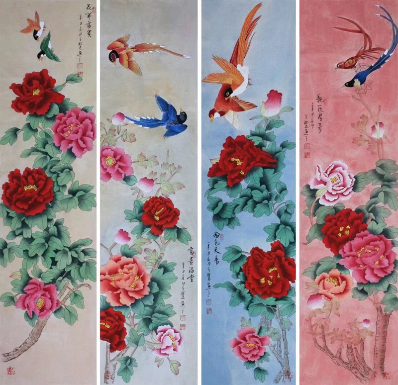 鸟语花香 四尺对开四条屏 136x34cmx4 画家高慧作品