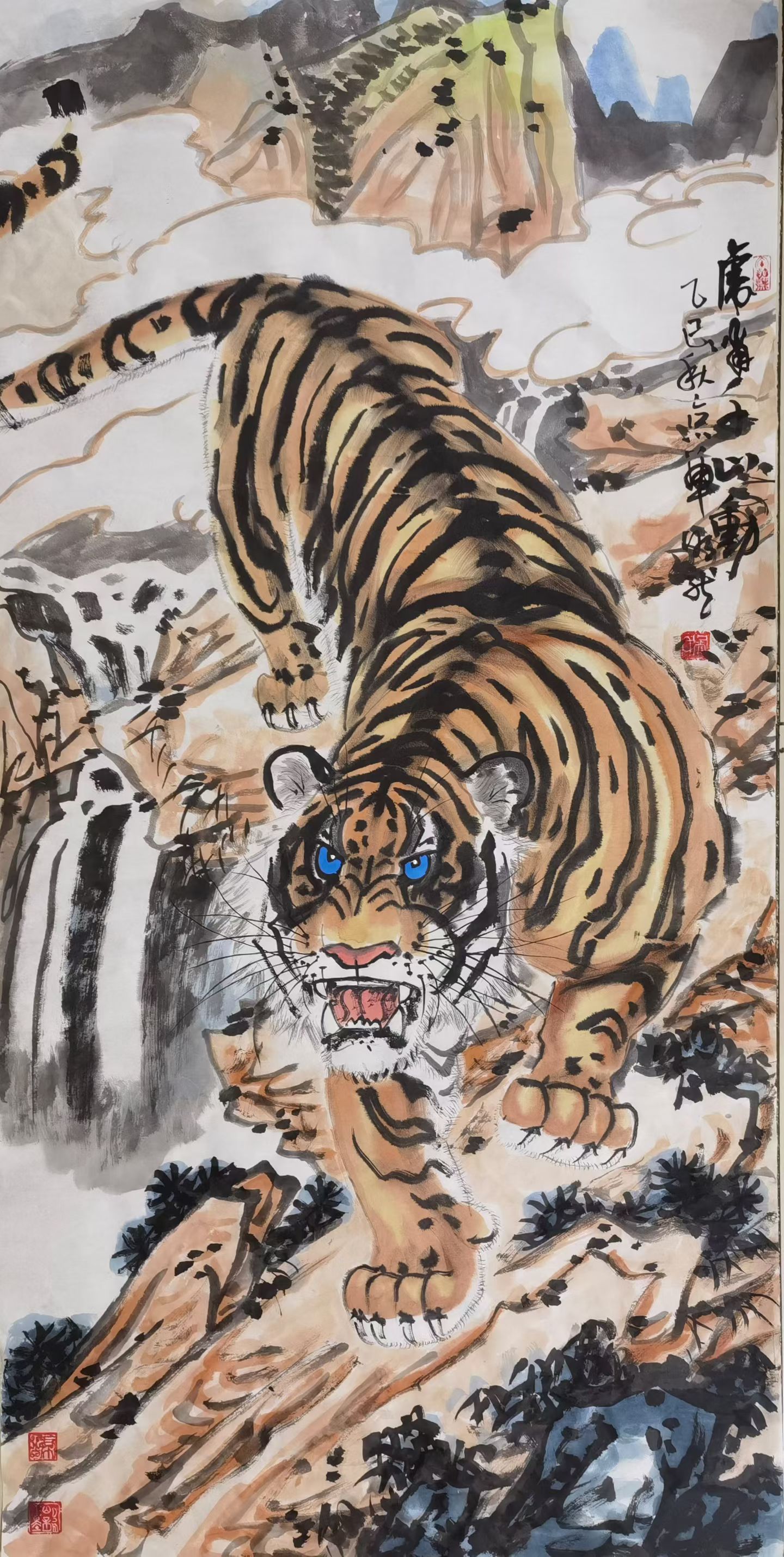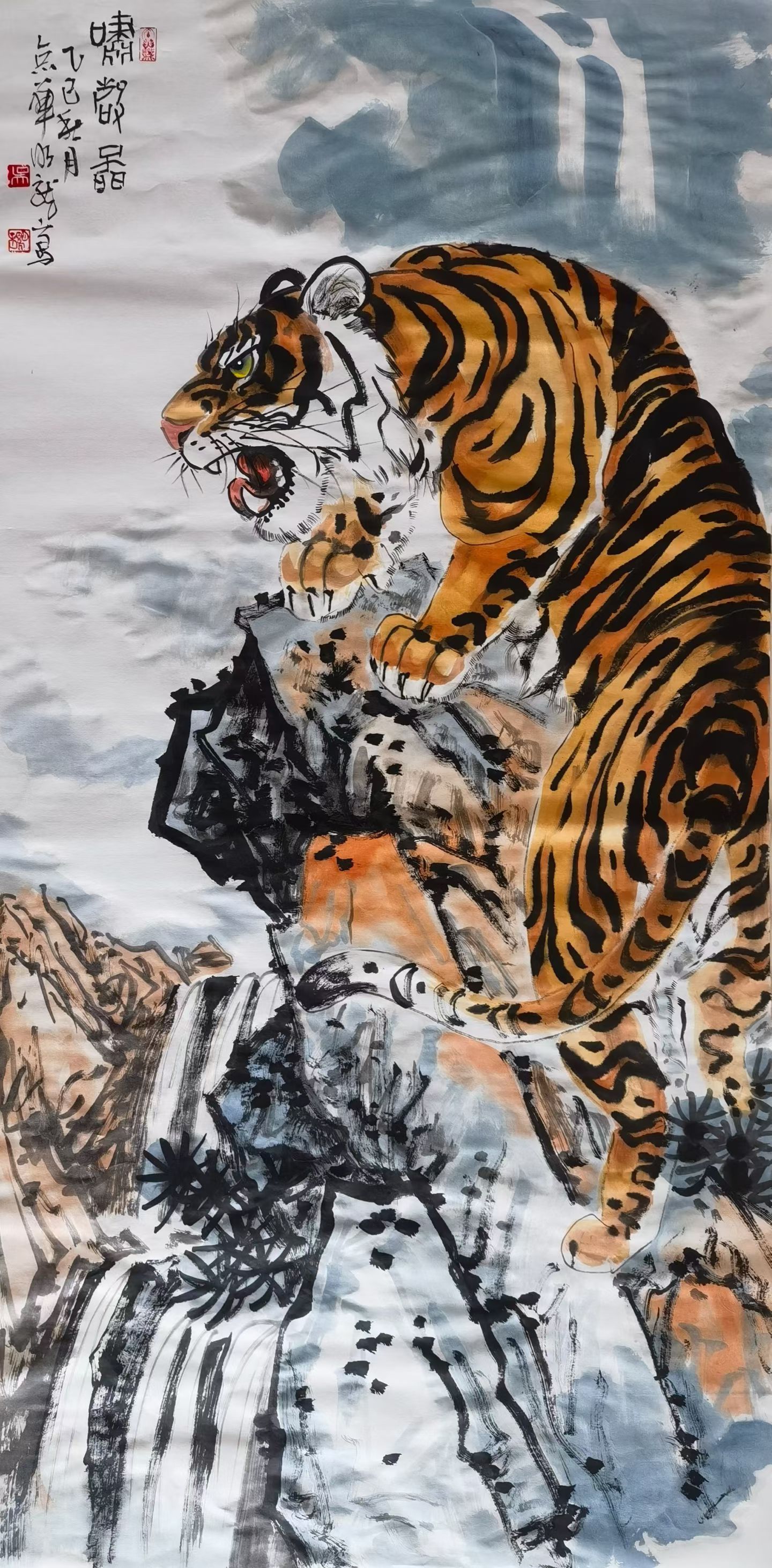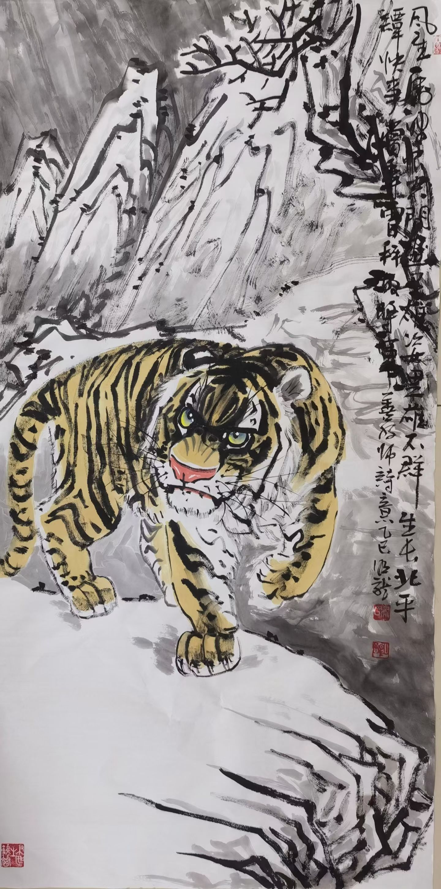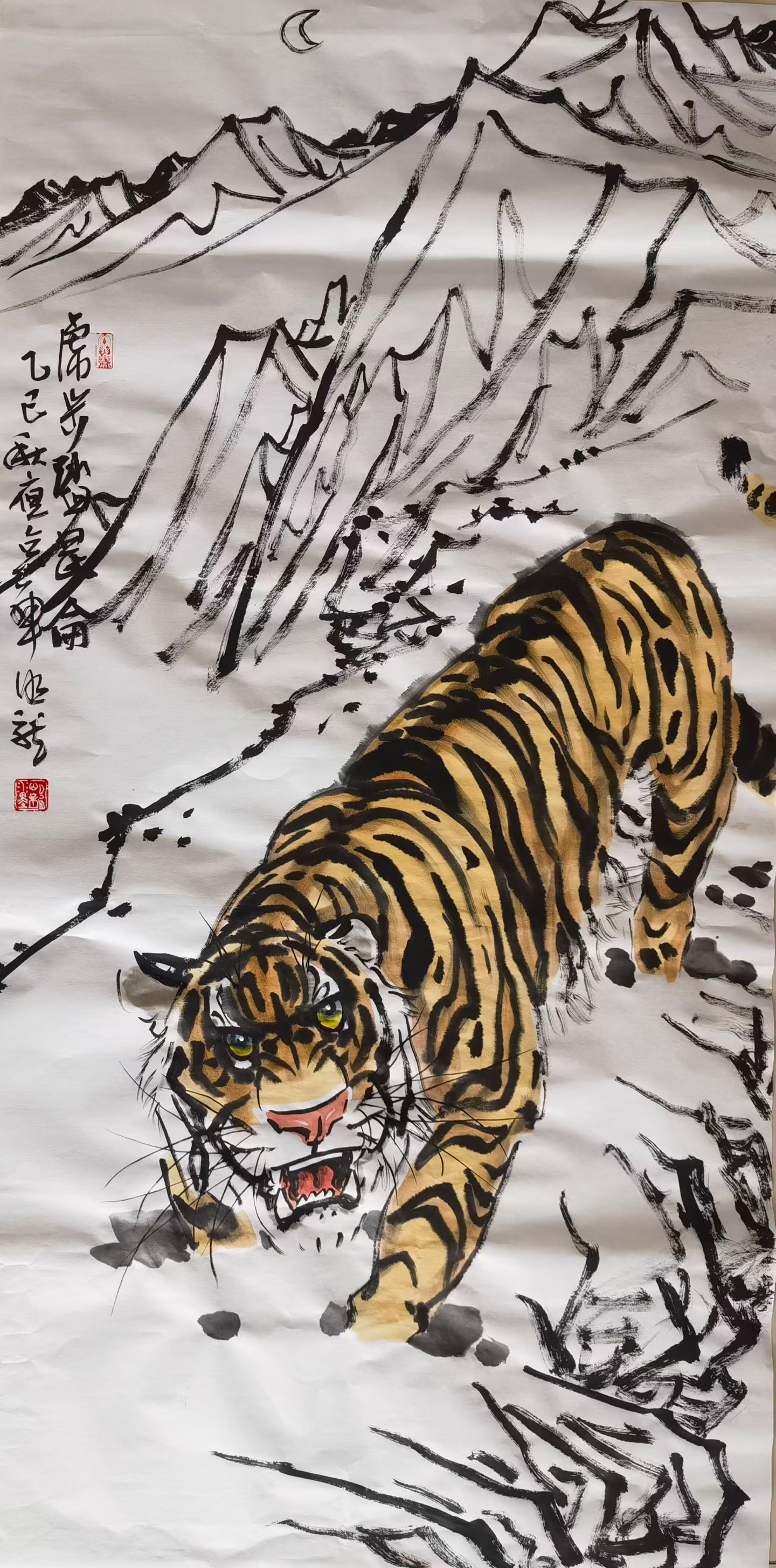 明龙兄画虎,笔墨老辣酣畅,纵横挥洒,山君形神兼备,威猛英武,虎躯顶天立地,虎目炯炯如炬,王者之气凌然纸上。